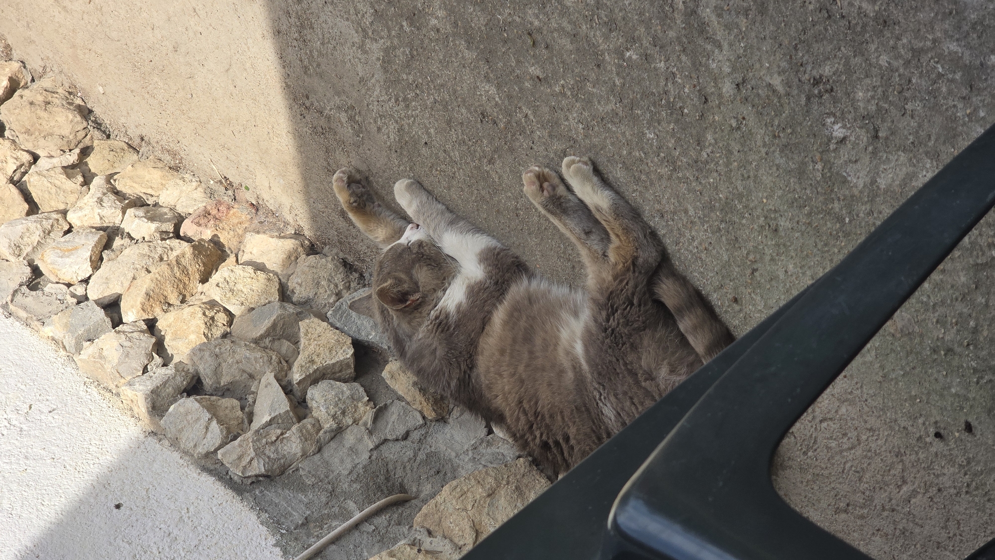 A gray and white cat lies on its back in the sun, near a rock wall and a concrete surface. Part of a black plastic chair is visible in the lower right corner. The location is likely Samovodene, Bulgaria.