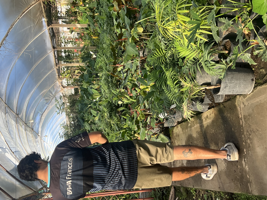 A person is observed from behind, walking along a narrow concrete path inside a greenhouse in Santa Rosa, Argentina. The individual, an adult male, wears a black and blue striped athletic shirt with "BBVA Frances" printed in white on the back, olive-drab shorts, and light-colored sneakers, one of which has "VANS" visible on the heel. Tattoos are present on both calves: a dark, abstract design on the right calf and a stylized "C" on the left calf. The greenhouse features an arched, translucent plastic roof supported by a metal framework and wooden posts. Numerous plants of various species, primarily tropical foliage such as palms, philodendrons, and peace lilies, are densely arranged in black plastic nursery bags and dark pots on both sides of the pathway, extending into the background. Some larger plants are contained in repurposed black barrels. Natural light filters through the roof, illuminating the scene. A single incandescent light fixture is visible hanging from the ceiling structure. No other individuals are present, and the person is solely engaged in walking through the plant-filled environment.