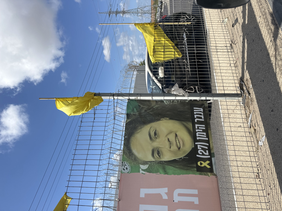The image displays an outdoor scene in Kfar Yona, Israel, featuring a wire mesh fence with attached banners and flags under a partly cloudy blue sky
