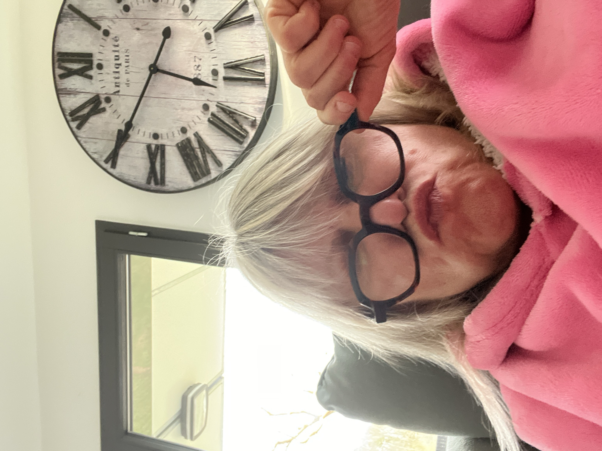 A selfie-style photograph features a fair-skinned individual with light blond hair, donning a pink hooded garment. The person is holding black-framed eyeglasses in front of their face. In the background, there is a clock with Roman numerals reading approximately 1:52 and the inscription "Antiquite de Paris". A window with a black frame is also visible in the background. While the image suggests an indoor environment, it is not possible to confirm the location as Chambœuf, France, based on the provided image alone.