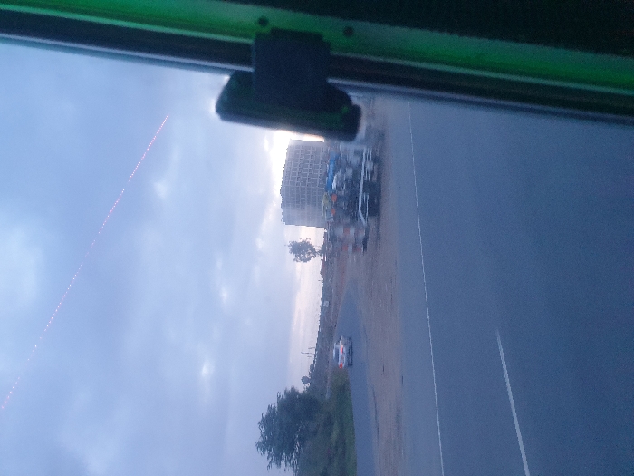 A building and construction vehicles are seen from inside a vehicle, likely a truck. A highway is visible, with a car moving in the opposite direction. Green trim is seen above, possibly from the vehicle’s interior. The sky is overcast, with a red line running horizontally across the frame.