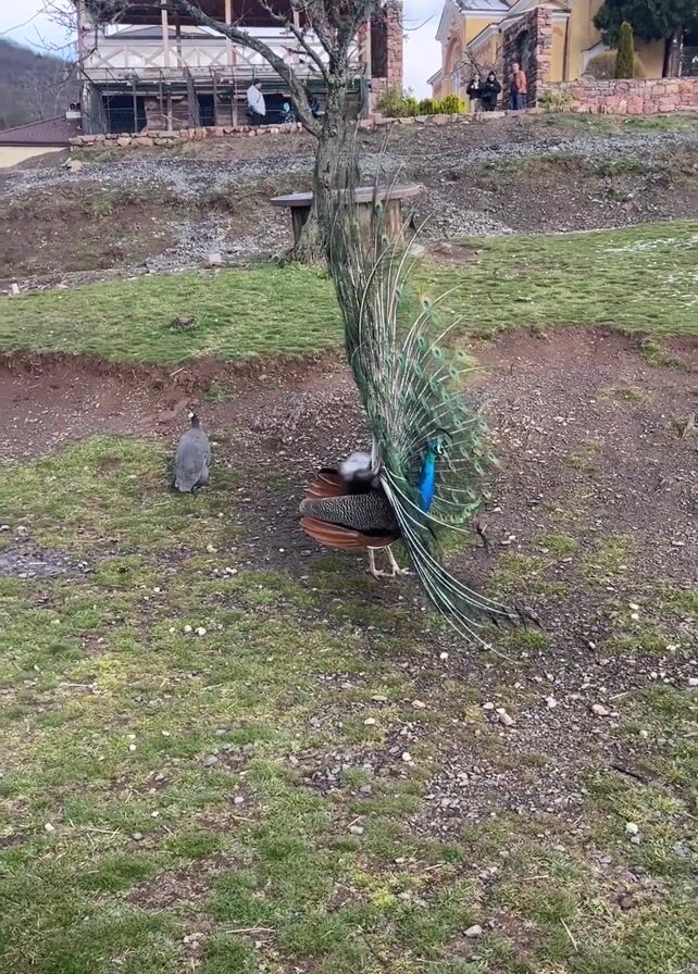 peacock displaying its feathers on a grassy hill. A guinea fowl stands nearby. In the background, a two-story building with a wooden deck is visible, along with a church with a white dome. Several people can be seen on the hill behind the buildings. The ground is covered with patches of grass and some bare dirt, with a few small pieces of snow. A bare tree is situated between the peacock and the building. The sky is overcast.