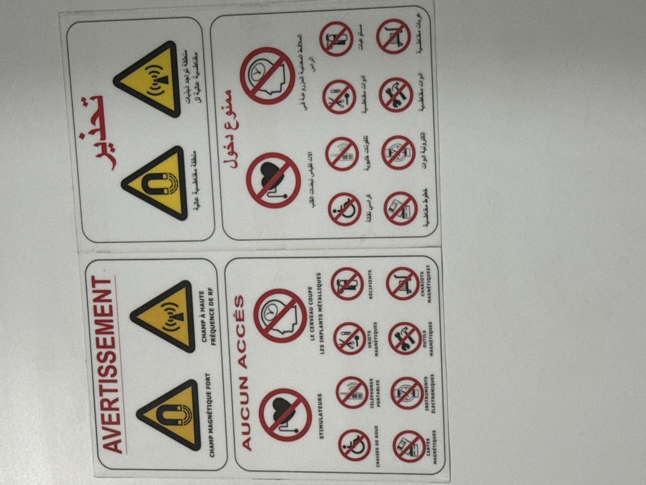 two sets of warning labels, one in French and one in Arabic. Both sets caution against entry due to strong magnetic fields and high radio frequency presence. Symbols warn against bringing metallic implants, pacemakers, wheelchairs, cellphones, magnetic objects, electronic instruments, and magnetic cards into the area. The Arabic set uses the word "forbidden" for "no access", while the French set uses the word "warning".