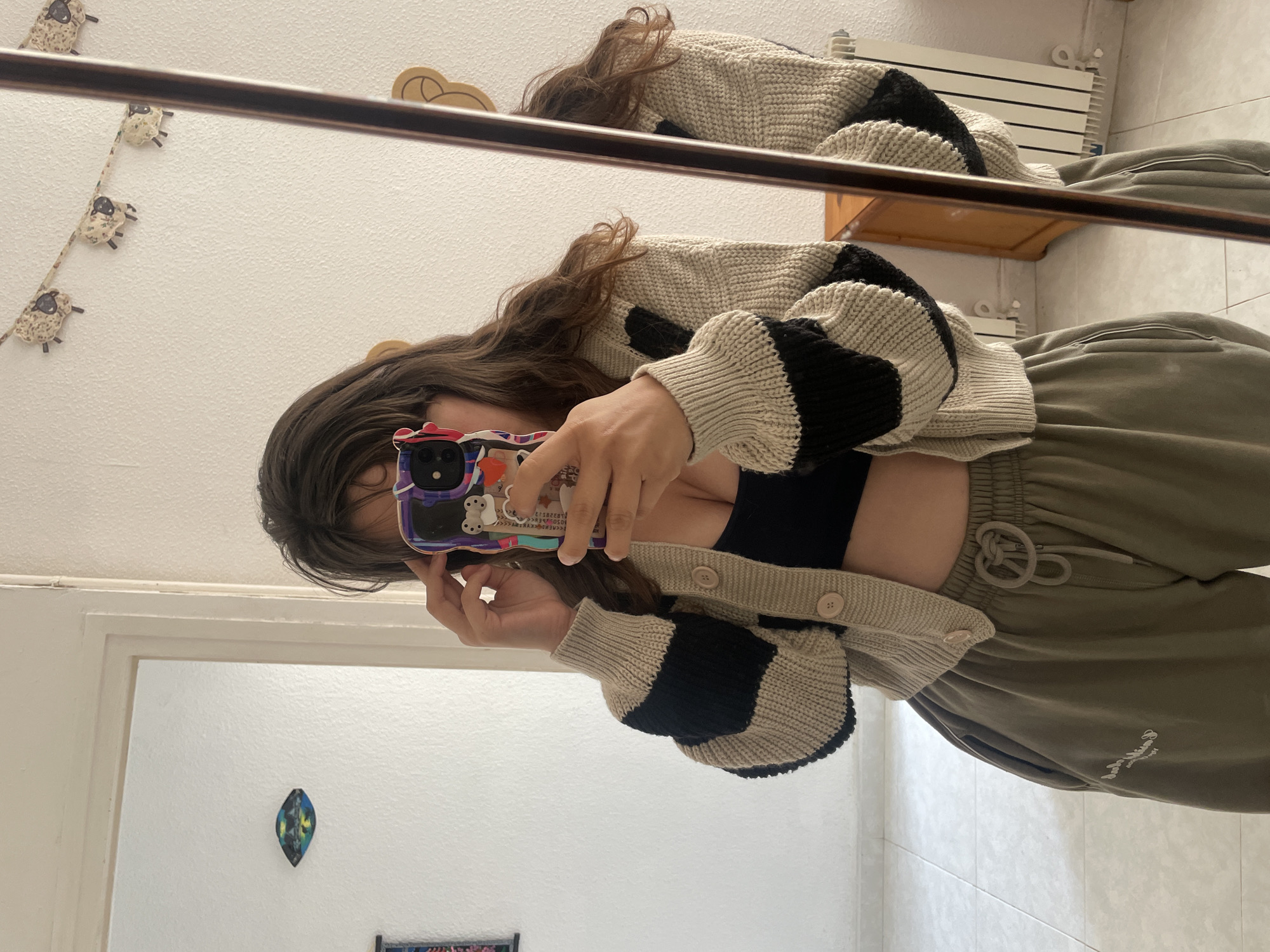 A female subject is depicted in a mirror selfie taken within what appears to be a residential interior in Canet de Mar, Spain. The subject stands centrally, holding a smartphone with a multi-colored, patterned case featuring a Hello Kitty character, obscuring her face. Her left hand is raised towards her head. She is wearing a black sports bra, a loose-fitting beige knit cardigan with black horizontal stripes on the sleeves and three visible light-colored buttons, and olive green drawstring sweatpants with white lettering visible on the left thigh. The environment reflected in the mirror and partially visible around the subject consists of textured white walls. The floor is covered with light-toned square tiles. To the left, a white door frame is visible. On the upper left wall, a small, dark, eye-shaped decorative item is affixed. On the upper right wall, a garland of several small, patterned sheep-shaped decorations is strung. Below this, two light-brown, curved decorative pieces are present. To the right of the subject, a wooden cabinet with a curved front is visible, followed by a white wall-mounted radiator. The image captures the subject's reflection from approximately the mid-thigh level upwards.