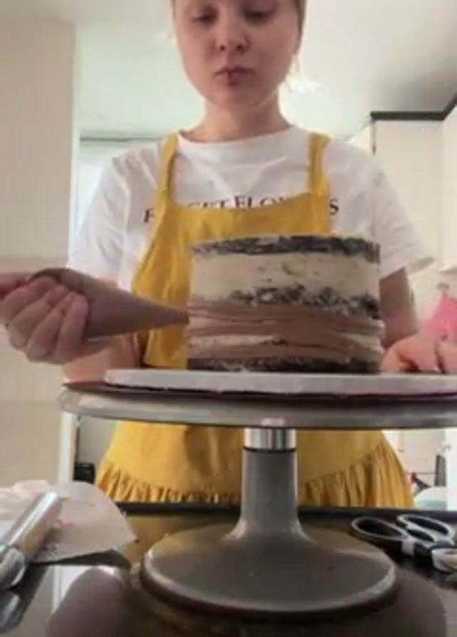- "A woman wearing a white t-shirt and yellow apron is shown from the waist up decorating a multi-layered cake with chocolate frosting using a piping bag" by FM-k41Xm2, licensed under CC BY 4.0