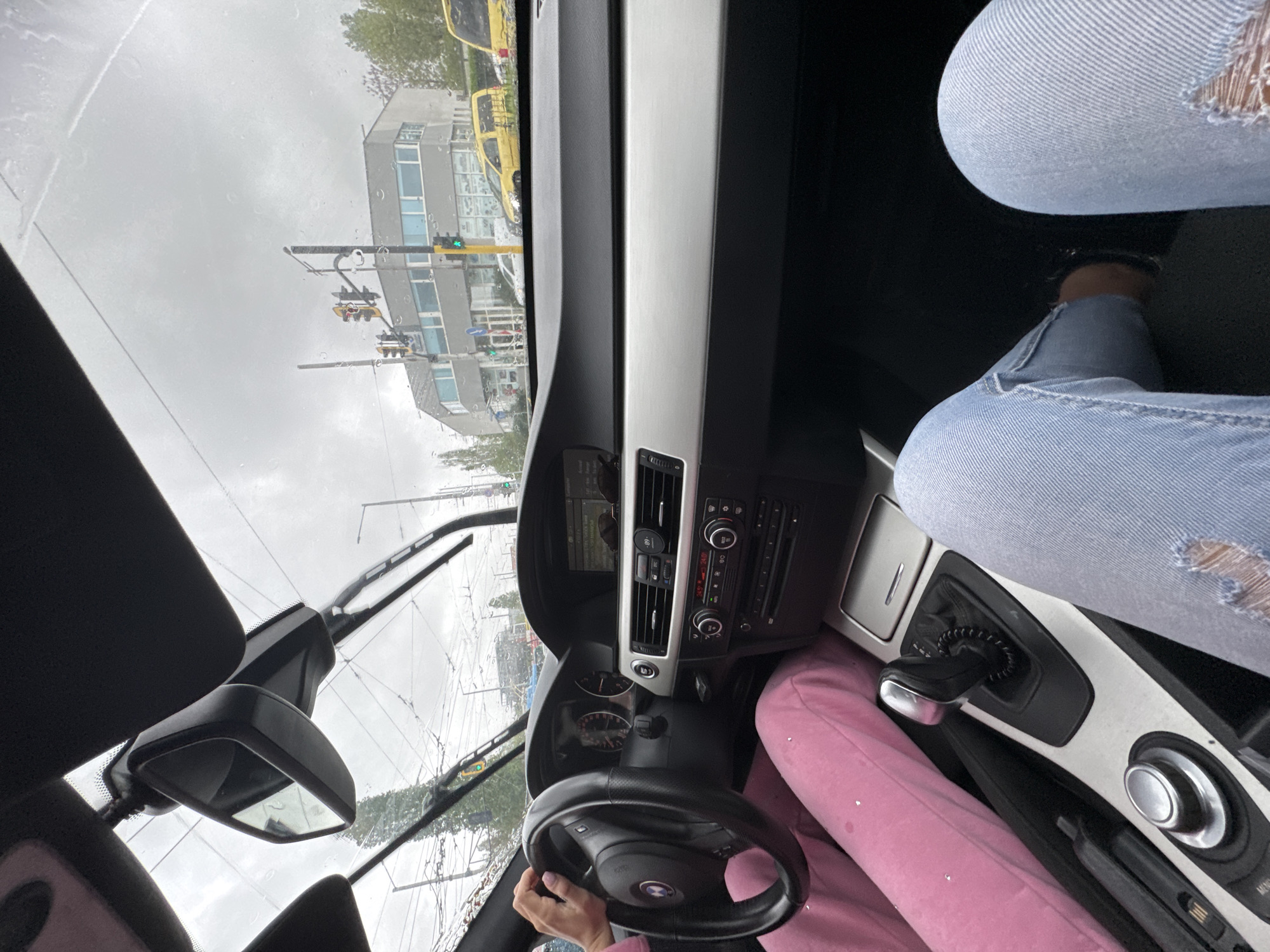 A car's interior is visible from an unusual angle, likely taken from a selfie perspective
