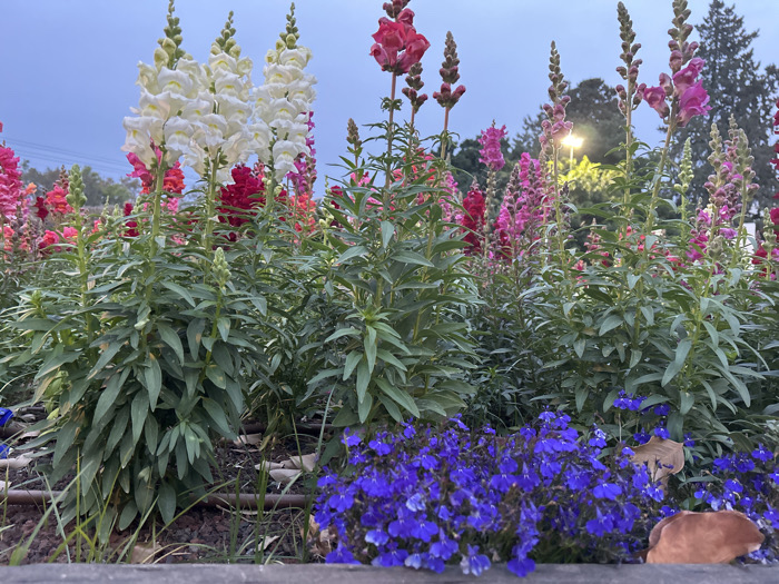 The scene depicts a landscaped flower bed in Holon, Israel, under low light conditions, likely dusk or dawn. The foreground presents a dark, horizontal barrier behind which are clusters of vibrant blue lobelia flowers. Dominating the mid-ground are numerous tall snapdragon (Antirrhinum majus) plants, exhibiting spires of white, red, and various pink/magenta blossoms amidst dense green foliage. Visible on the ground between the plants are dark soil or mulch, sparse green grass, and black irrigation drip lines. A bright yellow street light is illuminated in the mid-ground, partially obscured by the flowers and positioned in front of dark green trees. The sky above is a pale blue-grey. No individuals or specific activities are present.