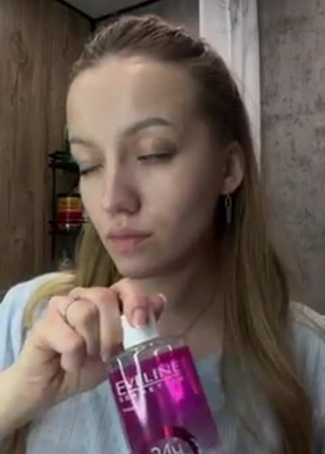 - "A woman with light blonde hair is in a bathroom, wearing a light blue button-down shirt, and holding a bottle of Eveline Cosmetics 24h Hydro Micellar Water" by FM-kDeyj2, licensed under CC BY 4.0