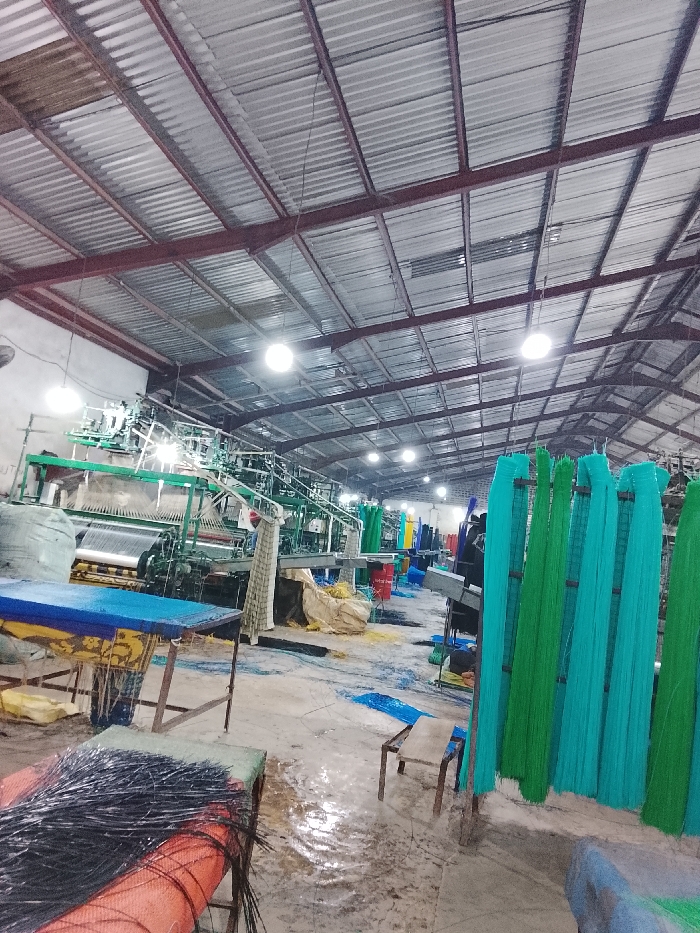 The interior of a factory reveals industrial machinery and hanging bundles of colorful threads, predominantly blue and green. These threads suggest the manufacturing of textiles. The space is illuminated by evenly spaced lights along the high, corrugated metal roof. Scattered debris and materials on the floor indicate an active workspace. A chair and several tables are visible, adding to the factory's functional setting.