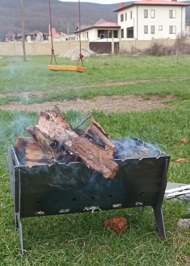 barbeque grill with burning wood in a grassy backyard. The grill is metal and sits on four legs. Several pieces of wood are stacked inside, emitting smoke and small flames. In the background, a yellow wooden swing hangs suspended from red ropes. Beyond the swing, there's a large white house with a red roof, followed by more houses and a hill in the distance. The sky is overcast. The overall impression is a quiet, domestic scene.