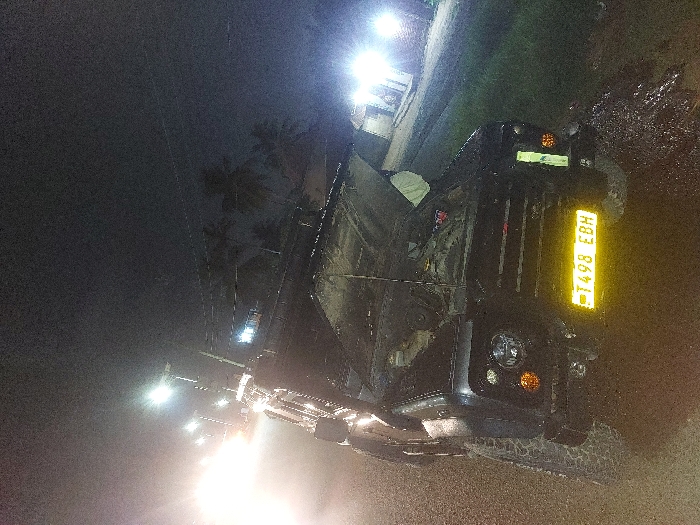 This nighttime image depicts a dark-colored off-road vehicle, specifically resembling a Land Rover Defender, with its hood raised, indicating an open engine compartment