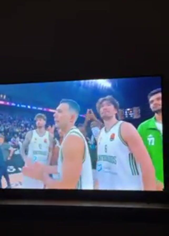 basketball game on a television screen. In the first few seconds, players wearing white and green jerseys give each other high fives and clap hands. The person in the foreground is wearing the number 10 jersey. At the 3-second mark, the screen shows a graphic with the logos and names of the two teams, LDLC ASVEL and PANATHINAIKOS BC AKTOR ATHENS.