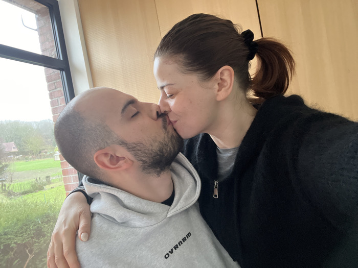 An indoor scene within a residential building in Carency, France, depicts two individuals kissing with closed eyes