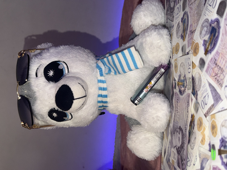 The scene, located in Corby, United Kingdom, displays a plush toy resembling a white and grey husky or wolf cub, centrally positioned. The toy features large, sparkly blue eyes with white star-like highlights, a black nose, and a stitched mouth. It wears a blue and white striped scarf around its neck, and dark sunglasses with gold-colored frames are perched on its head. Leaning against the toy's left front leg is a cylindrical object, consistent with a disposable vape pen, exhibiting a black body with a purple and blue gradient pattern and a visible barcode sticker. The toy and vape pen rest on a surface covered with multiple British twenty-pound banknotes. The background is blurred, showing a warm-toned surface and a horizontal strip of blue-purple ambient lighting. No individuals are present in the image.