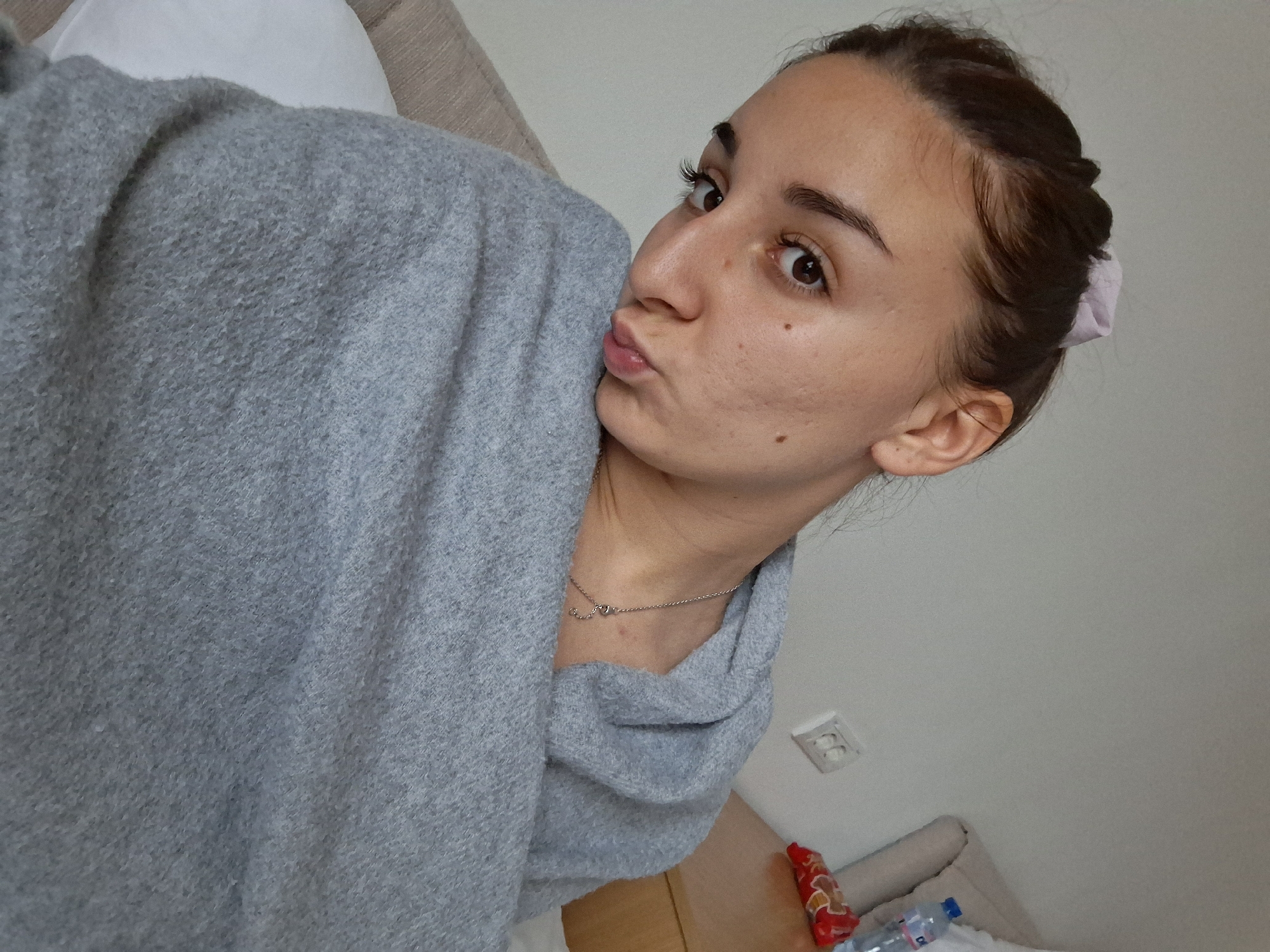 An indoor, close-up photograph depicts a young adult female, positioned diagonally, looking directly at the camera with a puckered lip expression. Her dark brown hair is pulled back, partially revealing a light pink scrunchie. She is wrapped in a grey, textured blanket that covers her torso and arms. A thin, silver-colored chain necklace with a small pendant is visible on her upper chest. The background features a plain, light-colored wall. To the subject's right, a portion of a light-colored upholstered furniture piece is visible, alongside a light brown wooden furniture item, likely a bedside table. On this table, a clear plastic water bottle with a blue cap and a red package of snacks are present. A white double electrical outlet is mounted on the wall behind the subject's right shoulder. The specific location within the city of Vozdovac Urban Municipality, Serbia, cannot be determined from the visual information provided in the image.