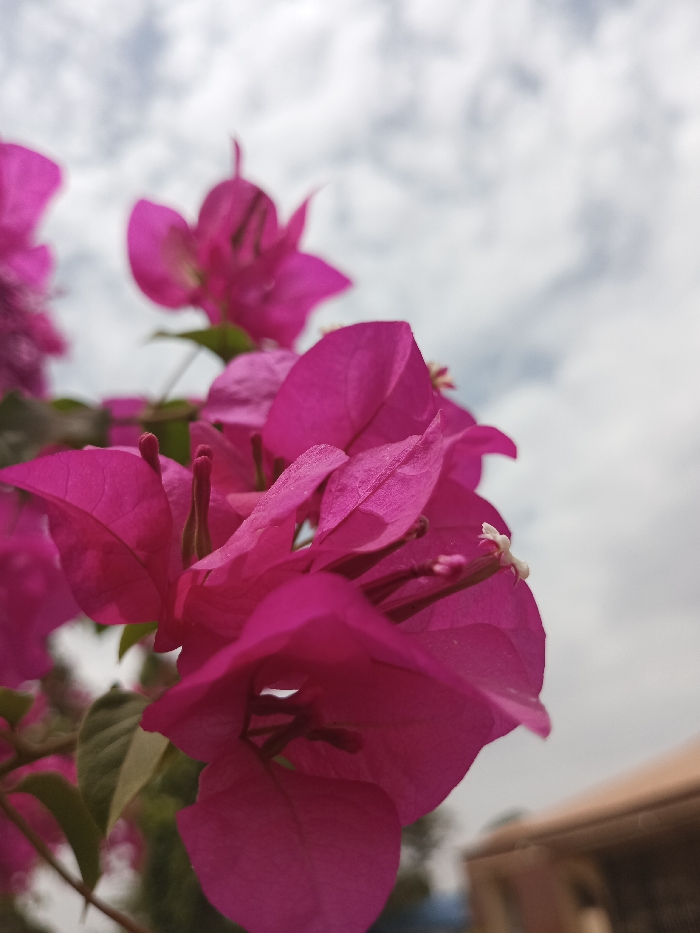 The image displays a close-up, upward-angled shot of vibrant magenta bougainvillea flowers, specifically located in Jos, Nigeria. A cluster of these flowers, characterized by their bright pink bracts and small, white, tubular true flowers with visible stamens, occupies the foreground and midground, with the most prominent cluster in sharp focus towards the right. Green leaves are partially visible behind and between some flower clusters. The background consists of an out-of-focus, cloudy sky with shades of white and light grey, suggesting an overcast condition. In the lower right corner, a blurry section of a light brown or tan building structure, possibly a roofline or eaves, is visible. No people or discernible actions are present.