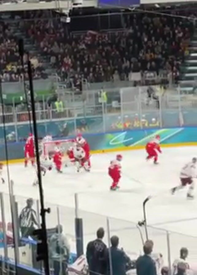 hockey game in a crowded indoor arena. Players in red and white uniforms are actively engaged on the ice, skating and wielding hockey sticks. The camera follows the action, capturing players passing the puck and maneuvering around each other. Surrounding the rink are protective glass barriers, behind which stand spectators and personnel wearing Olympic branded attire. In the background, a large screen displays the Olympic logo and other related branding.