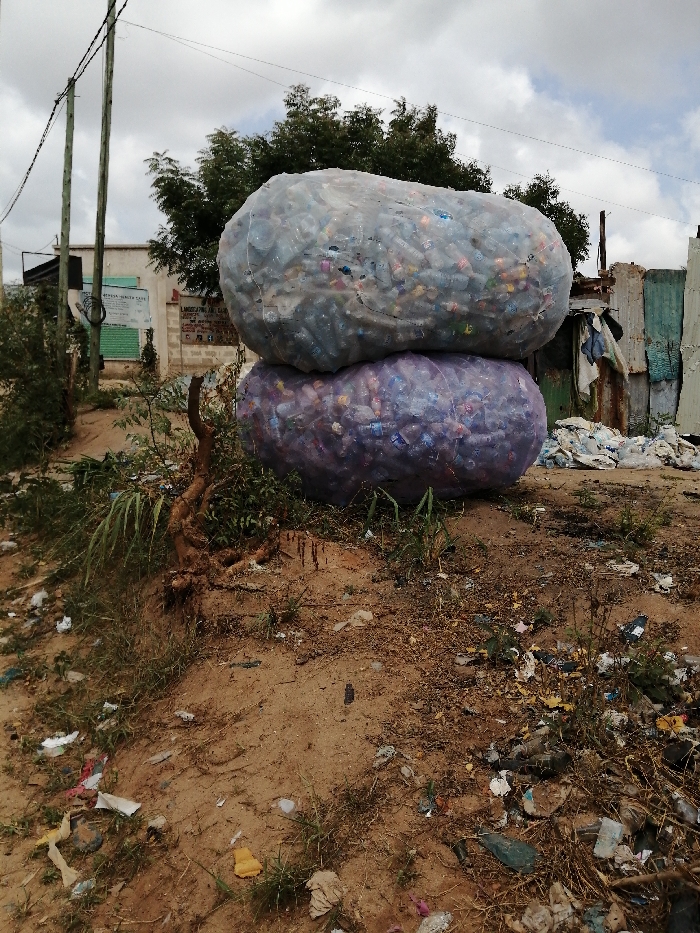 The image portrays an outdoor scene within a semi-urban or peri-urban area of Dar es-Salaam, Tanzania. Centrally, two large, translucent, irregularly shaped bales of discarded plastic bottles are stacked on top of each other. The upper bale is filled with clear and light-colored plastic bottles, while the lower bale contains purple and blue-tinted plastic bottles. They rest on uneven, reddish-brown dirt ground, which is extensively littered with various fragments of plastic, paper, and other refuse, interspersed with sparse dry grass and small plants. In the background on the left, a light-colored building is partially visible, featuring a green rectangular sign and additional smaller, darker signs affixed to its wall. One discernible sign reads "ANGELICAL HEALTH CARE." Two wooden utility poles, carrying overhead power lines, stand vertically near the left frame edge. Lush green foliage partially obscures the background near the building and poles. To the right of the bales, a makeshift structure consisting of vertical corrugated metal sheets, some exhibiting rust and discoloration (greens, blues, browns), forms a barrier or wall. Piles of loose plastic bottles and other discarded materials are accumulated at the base of this corrugated structure. The sky overhead is overcast with white and grey clouds. No individuals are present in the scene, and no explicit actions or interactions are depicted.