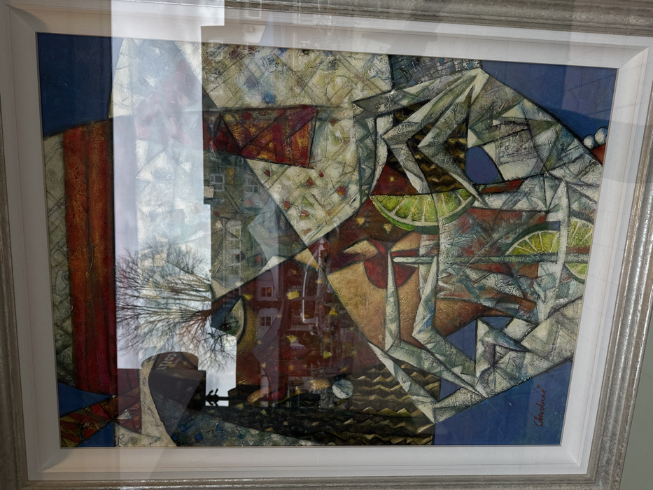 The scene depicts an abstract painting displayed behind a reflective glass surface, photographed within an urban setting in Epping Forest, United Kingdom