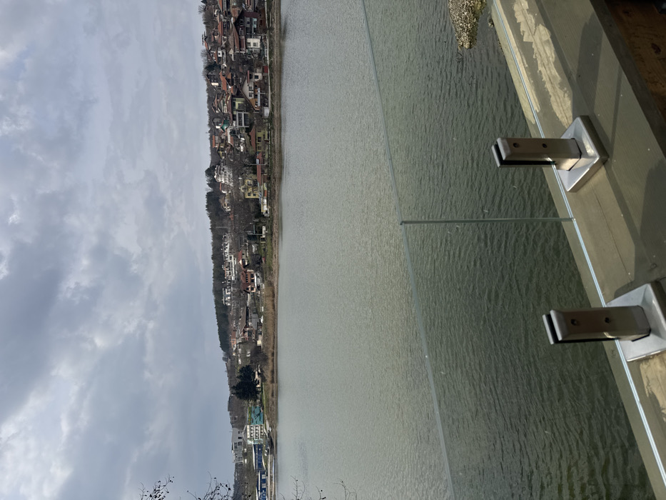 The image depicts a panoramic view across a body of water towards a residential area on a hillside, observed from a waterfront location in Nikolovo, Bulgaria. In the immediate foreground, a modern glass railing is present, with two prominent stainless steel spigots securing the glass panels. These spigots are mounted on a dark-colored horizontal surface, likely a wooden or composite deck. The midground features a wide expanse of calm, murky green-brown water, displaying subtle ripples across its surface. The far bank of this water body is characterized by a narrow strip of dormant, light-colored vegetation. On the left side of the far bank, a cluster of light-colored buildings with distinct blue roofs is visible, positioned close to the water's edge. Bare, dark tree branches partially intrude from the left foreground into the scene. The background is dominated by a densely developed hillside populated with numerous residential buildings of various sizes and architectural styles, featuring predominantly neutral-toned facades and red or orange-brown roof tiles. The hillside is partially covered with leafless deciduous trees and sparse vegetation, consistent with a winter or early spring season. The sky overhead is entirely obscured by a uniform blanket of grey, overcast clouds. No individuals are visible within the frame.