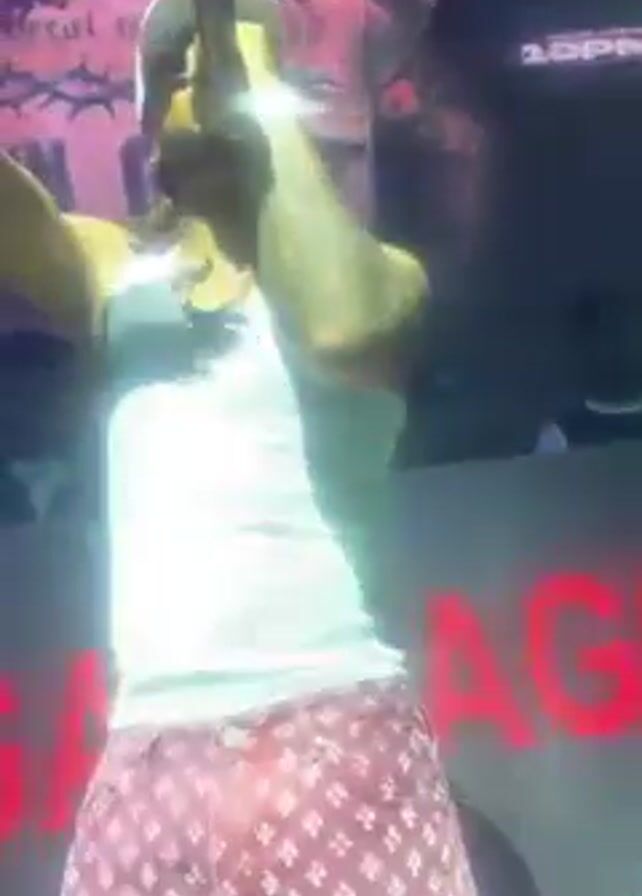 man singing into a microphone on stage. The man is wearing a white tank top and patterned shorts. In the background, there is a person at a DJ booth. Later, another person in a black shirt approaches the stage. The stage has a screen with green lights in the background. There are other people in the crowd. The stage is brightly lit, with some purple lighting. The video seems to have been taken from within the crowd.
