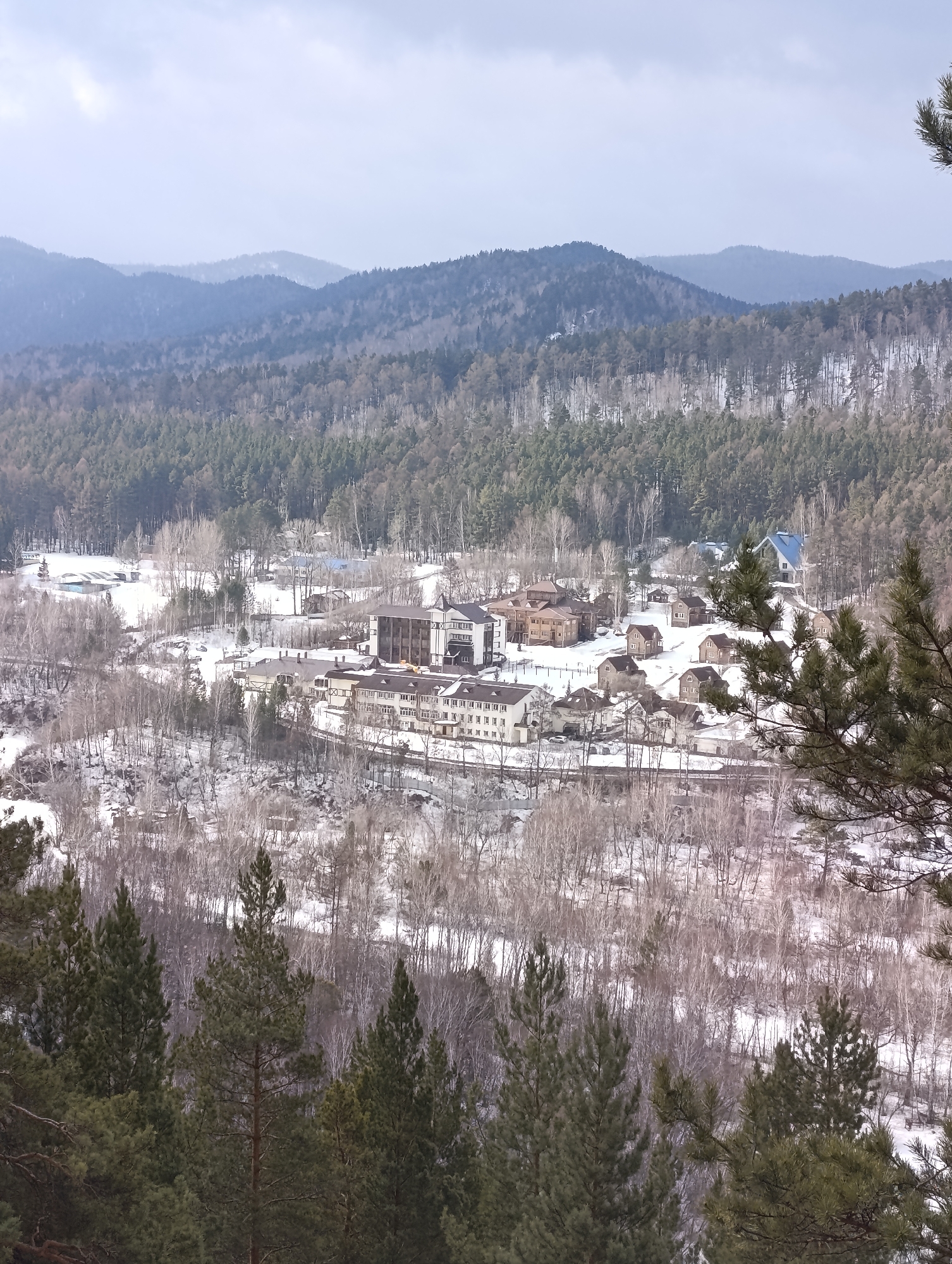An elevated, wide-angle photograph depicts a snow-covered valley and forested foothills in Krasnoyarsk, Russia. The sky is uniformly overcast, presenting a diffused, cool light. In the background, multiple layers of mountains or hills are visible, densely covered with dark green coniferous forests, receding into a light grey haze. The mid-ground features a valley floor blanketed in white snow. A significant portion of this area is populated by numerous deciduous trees with bare, skeletal branches, interspersed with dark green conifers. A settlement occupies the central mid-ground. The primary structure is a multi-story building complex, appearing to be a resort, hotel, or sanatorium, characterized by light-colored facades and dark brown, sloped roofs. Several smaller, detached wooden or stone houses and cabins, most with brown roofs and one with a distinct blue roof, are clustered around the main complex and extend up the right-hand slope. A snow-covered road or path snakes through the settlement. A single white vehicle is visible on a snow-covered path near the main building complex. To the far left mid-ground, an area resembling an outdoor swimming pool facility, with snow-covered structures, is discernible. The immediate foreground is occupied by dark green pine branches, partially obscuring the lower left and right corners of the frame. No individuals or active interactions are visible within the scene. The landscape indicates winter conditions, with a widespread snow cover and deciduous trees devoid of foliage.