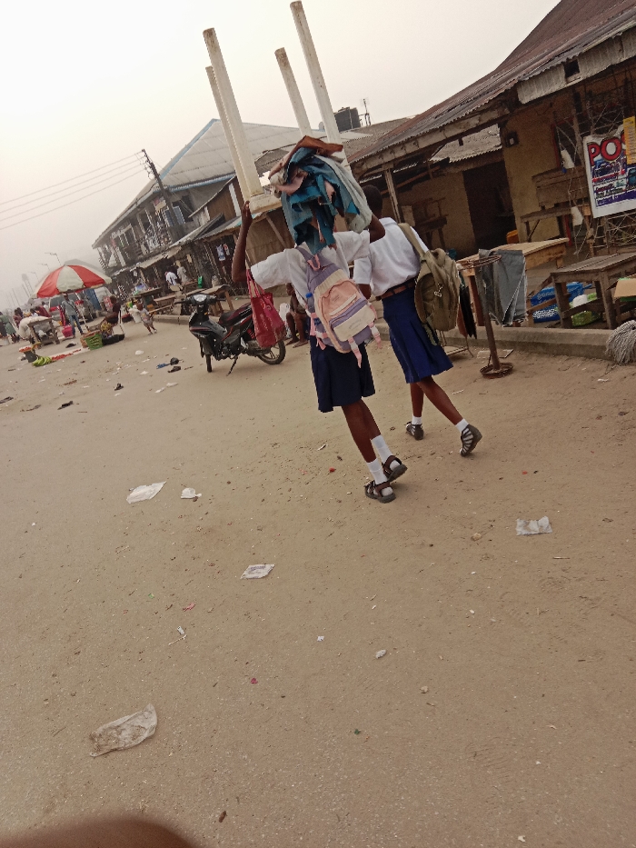 Two young girls wearing school uniforms walk on a sandy road, one carrying a bundle of fabric on her head. They both wear white shirts, navy blue skirts, white socks, and sandals. Backpacks adorn their backs. A motorcycle is parked nearby. In the background, there is a busy marketplace with stalls, people, and a red-and-white striped umbrella. Buildings with corrugated iron roofs line the street. The overall scene depicts a modest and possibly impoverished setting.
