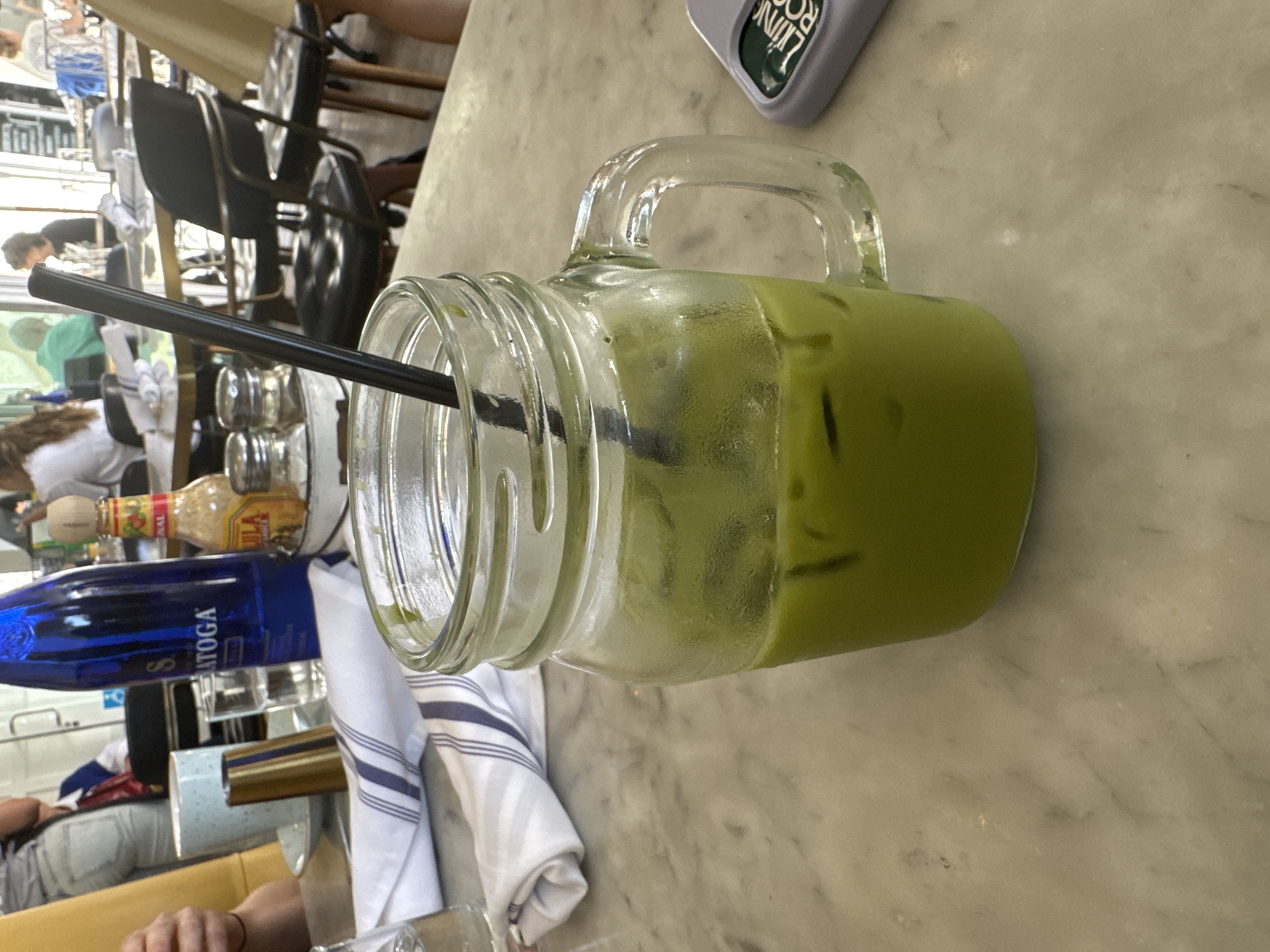 partially-filled glass mug with a handle and a black straw, containing a green liquid, likely a beverage. The mug appears to have ice cubes inside. It is positioned on a marble-patterned table next to a white and blue striped cloth napkin, a blue bottle labeled "SARATOGA," a small bottle labeled "JULA," and other table settings including glasses and a mug. In the background, there are people seated at tables, and what appears to be outdoor seating and building exteriors. Given the presence of "SARATOGA" water and the overall scene, this is likely a dining establishment in West Hollywood, United States of America. There is limited indication of specific activities or interactions beyond the drink and the setting of a restaurant table.