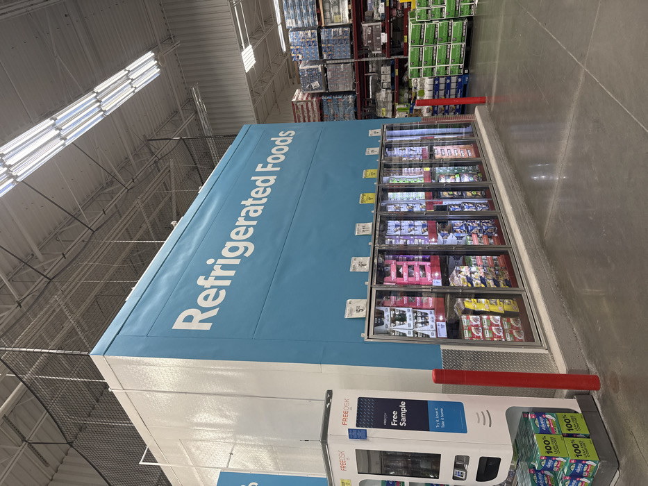 This interior image displays a large retail establishment, likely a warehouse club, located in Snellville, United States. The central focus is a prominent, standalone refrigerated unit, featuring a bright blue upper section with the white capitalized text 'Refrigerated Foods.' Below this, a row of at least six glass-fronted display doors reveals various packaged food products, each with a yellow price tag overhead. A grey diamond-plate kick plate runs along the unit's base. To the left, a white 'FREEOSK' machine offers 'Free Samples,' with 'Always' brand products stacked on a lower shelf. Two red protective bollards are positioned in front of the unit and kiosk. The environment includes high ceilings with exposed white structural elements, black netting, and linear fluorescent lighting. In the background to the right, tall metal shelving racks hold numerous palletized and boxed merchandise. The floor is polished concrete. No individuals, active interactions, or discernible actions are present.