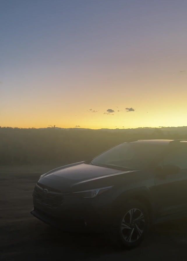 dark-colored Subaru parked on a dirt road at sunrise
