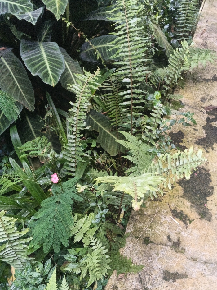 The image displays a dense arrangement of tropical foliage adjacent to a paved surface, located in the city of Unknown, Vietnam. The majority of the frame is occupied by various green plants, predominantly ferns and broad-leafed specimens. Specific flora includes tall ferns with segmented fronds, darker green broad leaves exhibiting prominent lighter veins, and smaller, intricate fern varieties. A single, small, five-petaled pink flower is visible near the lower-left center amidst the dense greenery. To the right, a light-colored, irregularly shaped concrete or stone pathway runs vertically, exhibiting areas of moss, dirt, and dark stains consistent with moisture exposure and weathering. No individuals or animals are present. The scene is static, captured under diffused lighting conditions.