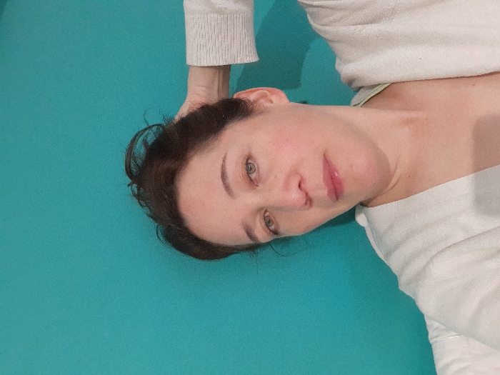 A single adult female is depicted in a close-up, head and upper torso shot, against a plain teal wall. She possesses medium-brown hair, styled in a loose, somewhat messy bun or pulled-back manner, with stray strands visible. Her skin tone is fair, and she has heterochromatic eyes, with the right eye appearing greenish-hazel and the left eye bluish-grey. Her lips are slightly parted, and her expression is neutral. She is wearing a light-colored, possibly off-white or light grey, long-sleeved knit cardigan. A narrow strap of a light green or yellow undergarment is visible on her upper right chest area. Her left hand is raised, with fingers touching the back of her head, appearing to either adjust her hair or rest. A portion of a white, textured fabric, likely bedding or a pillow, is visible in the lower left foreground. The scene is indoors. No specific visual cues within the image permit determination of a location within the city of Bogota, Colombia.