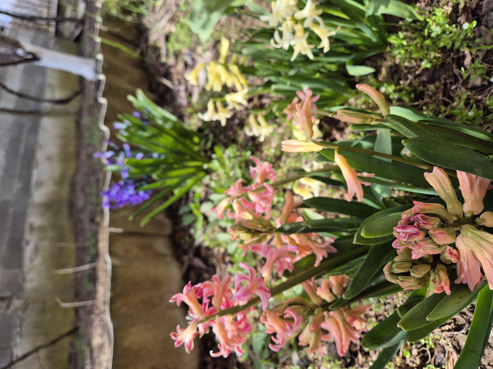 The image displays a garden scene in Zvezditsa, Bulgaria, featuring multiple clusters of flowering plants under natural light. In the foreground, several stalks of blooming hyacinths are visible, predominantly in shades of pink and light orange. Some flower buds are also present on these stalks. The plants have vibrant green, sword-shaped leaves. To the right and slightly behind the pink hyacinths, a cluster of yellow hyacinths is in bloom, with additional unopened buds visible. Further in the background, a smaller cluster of purple hyacinths is identifiable, partially obscured. The ground consists of dark soil with sparse green weeds and small white flowers. A low, wavy, grey-brown corrugated fence or barrier runs horizontally across the mid-background. Behind this barrier, a concrete block wall is visible, with a section of a tree trunk, painted white, on the right side. Bare tree branches are also present in the upper background. No people are visible. The scene appears to be outdoors, likely during daylight hours, indicating a spring or early summer setting.