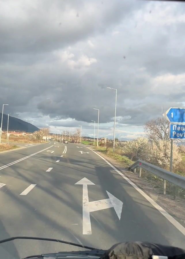 road trip, with the view captured from inside a vehicle, possibly a car or van. The camera looks forward through the windshield, capturing the road ahead. The road is paved with white lines marking lanes. Road signs are visible, though their text isn't clear. The scenery includes fields with green grass, utility poles, and distant mountains. The sky is overcast with cloudy weather. Music plays in the background. The camera also briefly shows the interior of the vehicle, focusing on the window frame and dashboard. A white contrail is visible in the sky, likely from a plane.