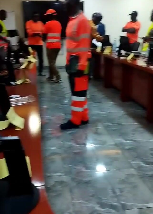 Here is a detailed description of the video: **Scene:** The video appears to be taken inside an office setting. **Environment:** The room has a polished marble-like tile floor. The walls are a light color, possibly white or off-white, with ceiling lights that provide bright illumination. There is a large wooden table that spans the length of the video, with several computer monitors placed along the table. **People:** There are several individuals in the room. Most of them are wearing safety vests and/or reflective striped pants and shirts. The color of the safety vests and shirts varies, including orange and yellow. Some are wearing hats or caps. There are at least 6 people in the video. **Objects:** Several desktop computers are present along the table. The camera lingers on a desktop littered with sticky notes, a bottle of soda, and a keyboard. **Actions:** People are standing, walking, and possibly looking at documents. One individual is speaking while gesturing with his hand. **Interactions:** The people appear to be engaged in a discussion or briefing, possibly related to a work project. They are standing around the long table, presumably discussing something related to the computer monitors and documents on the table. **Additional notes:** The presence of safety vests and reflective clothing suggests that the people are potentially involved in construction, engineering, or another industry where safety attire is required.