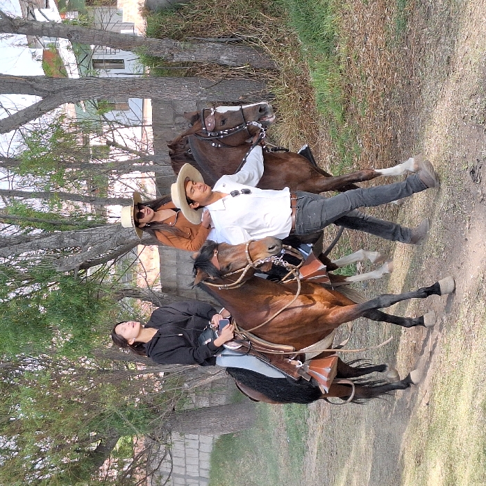 Three people are riding horses in an outdoor setting. The first person, in a black jacket, is focused ahead while holding reins. Behind them, a woman in a brown top and sunglasses wears a straw hat. The last rider wears a white shirt, dark pants, and a similar hat. All are on horseback in a grassy area with trees. A house is visible in the distance.