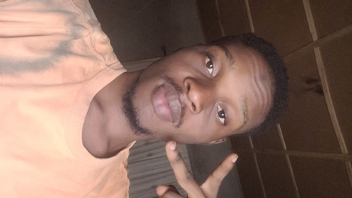 This image, reportedly taken in Badiko, Nigeria, features a close-up, chest-up portrait of a young adult male. The subject possesses dark skin, short dark hair, a thin mustache, and a short goatee. His dark eyes are directed forward, towards the camera. His lips are slightly pursed in a pout. He is wearing a light orange crew-neck t-shirt. His left hand is raised beside his face, forming a 'peace sign' gesture with the index and middle fingers extended. The background indicates an indoor setting, with a dark brown ceiling visible, composed of panels or planks intersected by lighter-toned structural beams.