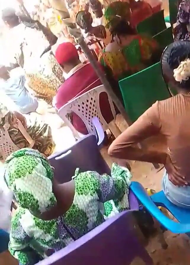 large crowd of people gathered outdoors under a canopy. Most people are seated in chairs, with their backs to the camera. Some people are standing in an open area, and there appear to be performers dancing in traditional clothing. The ground is dirt. The video is taken from a low angle, looking up at the crowd.
