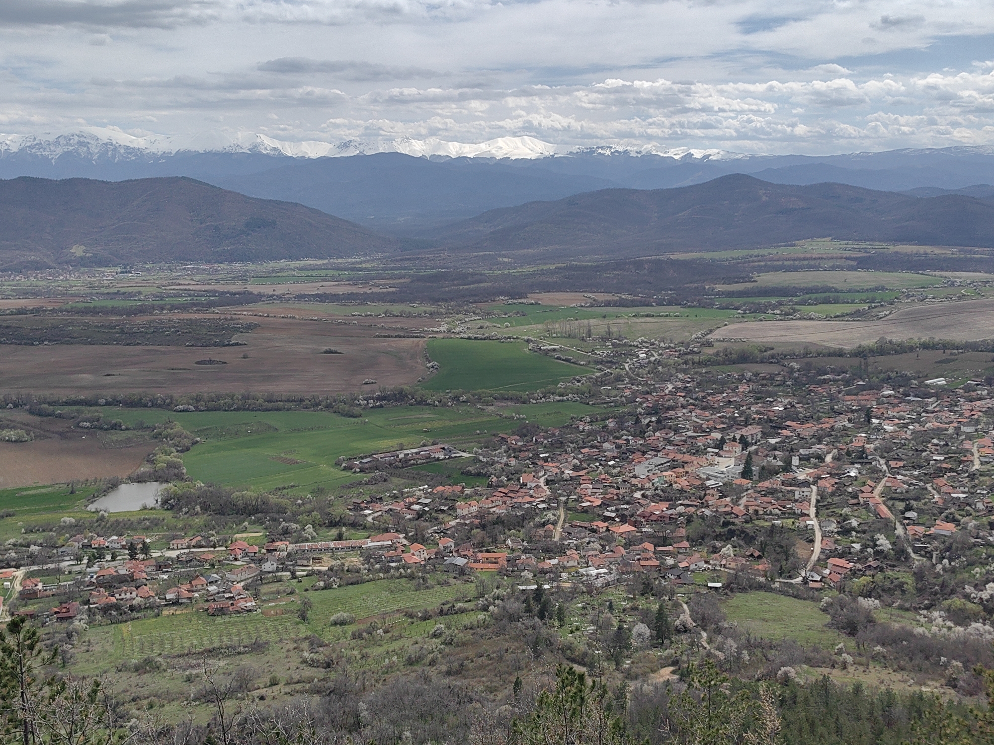 The image presents a panoramic view of Vrabevo, Bulgaria, showcasing a sprawling village nestled in a valley, framed by mountain ranges in the background. The foreground reveals a section of forested terrain, gradually transitioning into the settlement marked by clusters of houses with predominantly red tile roofs. Beyond the village, agricultural fields exhibit patches of green and brown, indicating different stages of cultivation or crop types. Further in the distance, the terrain ascends into hills and mountains, eventually culminating in a snow-capped mountain range under a sky with partial cloud cover. The overall scene conveys a sense of rural landscape and mountain scenery.