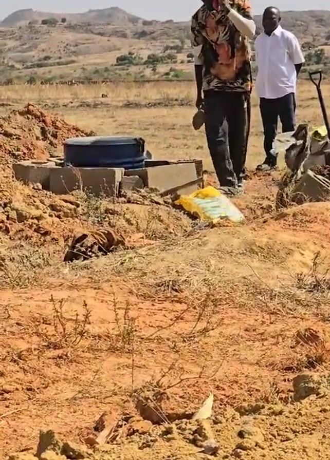 two men in a field. One man is wearing a patterned shirt and dark pants and is using a piece of concrete to work on something. The other man is wearing a white shirt and dark pants and is standing nearby watching. In the foreground is a dirt area with some sparse vegetation. In the background is a hillside with some scattered trees and buildings. There is also a blue barrel and a yellow bag near the first man. He is also talking on the phone in one shot.