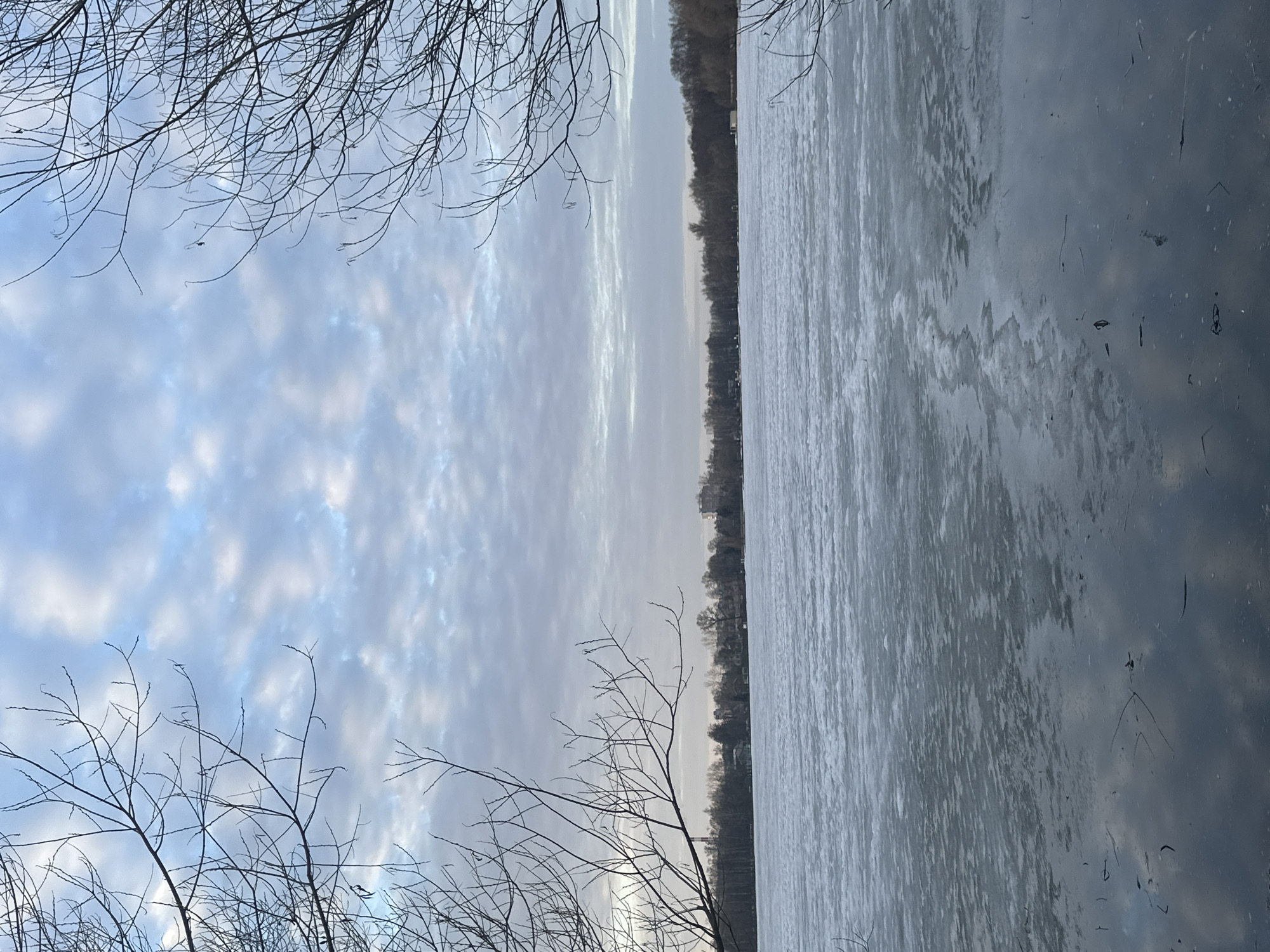 The image depicts a winter scene at an icy body of water in Moscow, Russia. The foreground contains bare tree branches. The sky is overcast with blue patches of sky. The surface of the water is partially frozen with ice. A thin treeline separates the water from the sky.