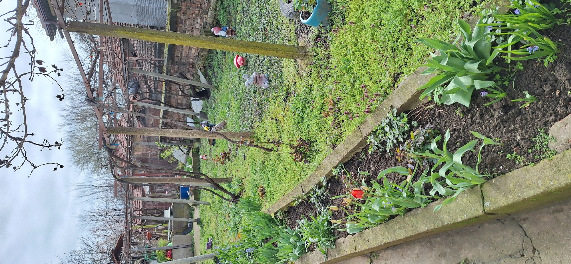 A garden in Letnitsa, Bulgaria, is depicted under an overcast sky during early spring. The foreground presents a rectilinear flower bed, bordered by concrete blocks, filled with dark soil. Within this bed, green shoots of various plants are emerging, including several tulip plants, one displaying a red bloom, and clusters of smaller green plants with purple flowers. Adjacent to the flower bed, the ground is covered in dense, low-lying green vegetation intermixed with small purple blossoms. In the midground, several weathered posts, possibly concrete or wood, support an overhead trellis or pergola structure with dormant vine branches. This area is characterized by a grassy ground cover mixed with weeds. Scattered across this space are multiple garden ornaments, specifically a grey rabbit figurine, a red mushroom figurine, and a traditional garden gnome figurine dressed in blue and red. A blue tire repurposed as a planter is visible on the right edge. The background reveals a series of residential or utilitarian structures with weathered red tiled roofs, partially obscured by a brick wall and a sparse collection of deciduous trees, some with visible buds. No individuals are present or engaged in any activity within the observed scene.
