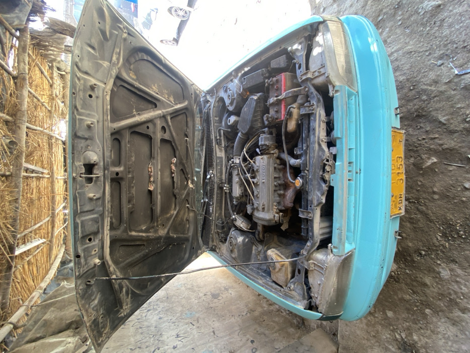 - "This image depicts the front view of a light blue (turquoise) sedan with its hood raised, revealing the engine compartment, in کوکران, Afghanistan" by FM-B5wmg2, licensed under CC BY 4.0