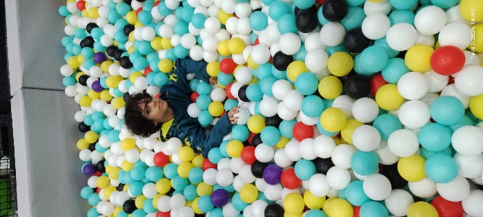 A child with curly hair lies in a ball pit. The pit is filled with white, turquoise, yellow, red, black, and purple plastic balls. The child wears a dark jacket with a yellow design on the shoulders. The ball pit appears to be indoors, with padded grey walls visible on the left side.