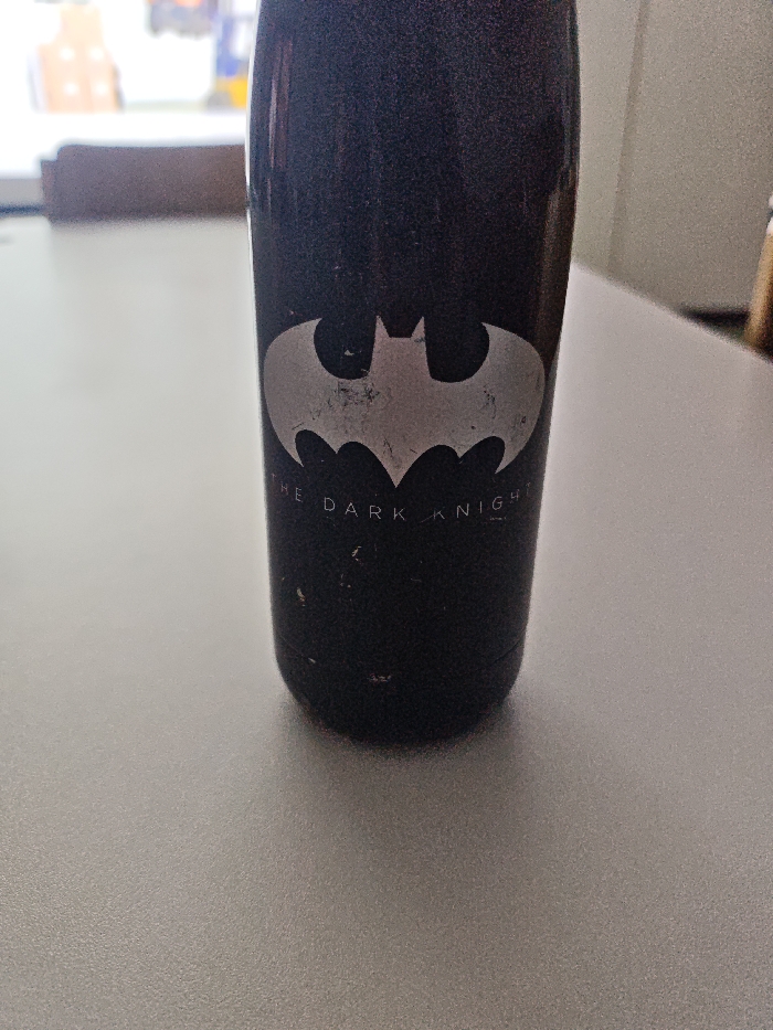 An upward-facing photograph captures a black, cylindrical travel mug resting upright on a light-grey, textured surface. The mug features a prominent silver-grey Batman symbol centered on its visible side. Below the symbol, the text "THE DARK KNIGHT" is visible in a smaller, matching silver-grey font. Both the symbol and text show significant wear, exhibiting scratches and abrasions. The black surface of the mug also displays numerous small white scratches and scuffs. The background is blurred, revealing a bright, out-of-focus area to the left, possibly a window with indistinct light-colored architectural elements, and a darker, less defined area to the right. The scene is located in Leudelange, Luxembourg. No individuals, specific actions, or direct interactions are visible.