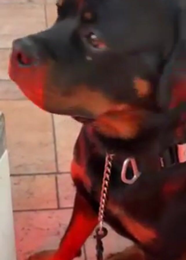 A medium shot shows a Rottweiler sitting and looking at the camera