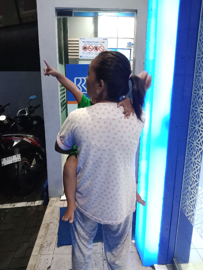 An outdoor scene in Kramat, Indonesia, depicts a woman standing with her back to the viewer, holding a young child. The woman has dark hair tied in a ponytail and wears light-colored, patterned pajamas. The child, in a green shirt and barefoot, is held on the woman's right hip, with their right arm extended upwards and to the left, pointing. The child's left arm rests on the woman's left shoulder. To the right of the subjects is a prominent vertical blue illuminated panel. Behind them, a glass door or window reveals the interior of what appears to be a Bank Rakyat Indonesia (BRI) facility, indicated by a visible blue "BRI" logo. A white sign with red 'no' symbols (e.g., no food, no smoking) is attached to the glass above the logo. The ground beneath the subjects is a combination of light-colored tiles and a blue doormat. To the left, two dark motorcycles are partially visible, parked on a darker paved surface. One motorcycle displays an Indonesian license plate, "H 5143 NJ".