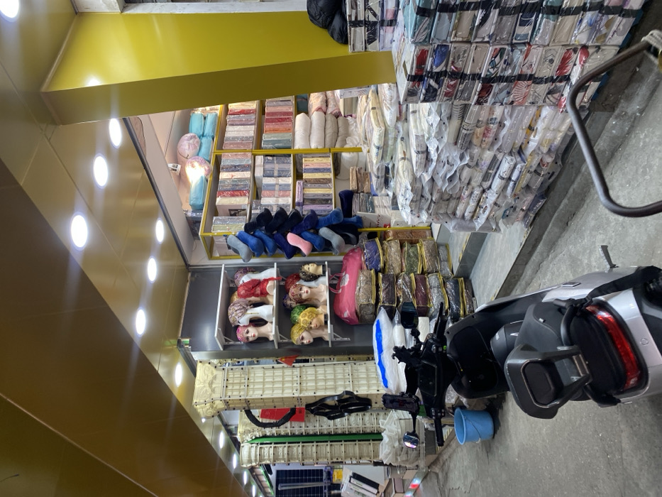 The image depicts an illuminated, open-fronted retail stall in Yuexiu District, China, likely at night or within an indoor market. The scene is characterized by a bright yellow overhead canopy with multiple recessed circular lights and a matching yellow vertical support beam on the right. In the foreground on the left, a silver and black scooter with a red taillight and a phone mount on its handlebars is parked on a grey concrete surface, next to a blue plastic bucket. Inside the stall, a white shelving unit on the left displays multiple mannequin heads, each adorned with a distinct colorful or patterned turban or headscarf. Below this unit, a large pink bag rests atop a stack of individually packaged textile items, wrapped in clear plastic. More stacks of similar packaged textiles, featuring various patterns, are visible behind it. Adjacent to the mannequin display, a vertical rack presents several colorful, soft items, such as hats or scarves, in shades of blue, black, pink, and grey. Further into the stall, a gold-colored shelving unit is filled with numerous neatly stacked, individually packaged textile products, such as bedding or blankets, organized by color and pattern. Additional light blue packaged items are visible on top of this unit. To the right, the floor space is dominated by extensive, tall stacks of individually packaged textile products, some appearing to be on elevated platforms, featuring diverse designs. A black garment rests on the top of a stack on the far right. No individuals are visible in the scene.