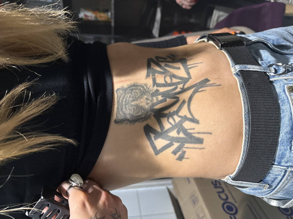 A close-up shows a person's side torso with a large black tattoo. The tattoo features a tiger's face at the top and stylized graffiti-like shapes. The person is wearing a black fitted top and light blue denim jeans with a thick black belt. Blonde hair is visible at the top of the frame. A hand with rings is visible, suggesting the person is holding or adjusting the top. The background is slightly blurred and includes a cardboard box with blue text.