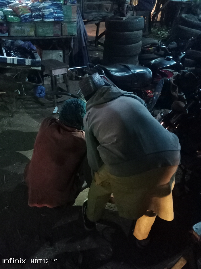 Two people stand beside a motorcycle. One person is kneeling and wearing a brown covering over their head. The other person wears a light gray hoodie and khaki pants. They appear to be working on the motorcycle in a dimly lit outdoor space. Stacks of tires are nearby, and goods are displayed on a table in the background.